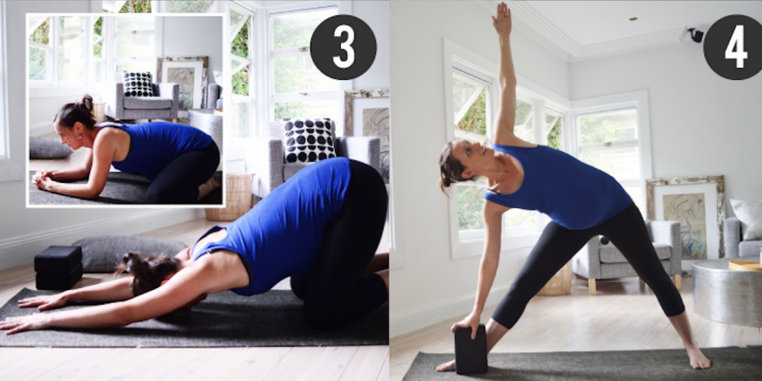 This is an elevated variation on the deep ‘birth’ squat a prenatal yoga pose that you see in most pregnancy and natural birth books. If you’ve ever looked at those full squats and thought ‘no way’, then this is the variation for you! Many women (especially beginners) simply do not have the hip or calf flexibility to sit in a deep squat unsupported. So by elevating the hips on one or two blocks or some stacked cushions you can make more space for your baby (squashing your baby is not a good idea!). Having one leg up and one leg tucked back helps to stabilise the balance and allows for some opening through the front of the thigh that is down. This is a great position for early labour as well if baby is head down and in a good position. In early labour you can bring some movement to the pose by using a rocking action with the hips.